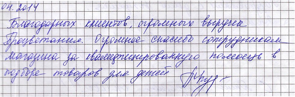 "Желаем хороших клиентов, а также хочу выразить благодарность за отличное обслуживание в вашем магазине!!!"