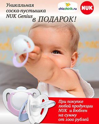 С 1 июня при любой покупке от 1000 рублей для малышей 0-6 месяцев и для будущих мам при условии приобретения любой продукции NUK (НУК) или Bubchen (Бюбхен), вы получаете в подарок уникальную ортодонтическую пустышку NUK Genius!